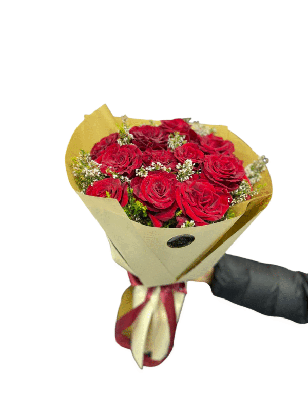 Exprimez vos sentiments avec élégance. Ce magnifique bouquet est composé de douze superbes roses rouges, soigneusement enveloppées dans un papier crème raffiné et nouées avec un ruban en satin. Des petites fleurs blanches et feuillages frais viennent sublimer l’ensemble, pour un résultat à la fois romantique et intemporel.